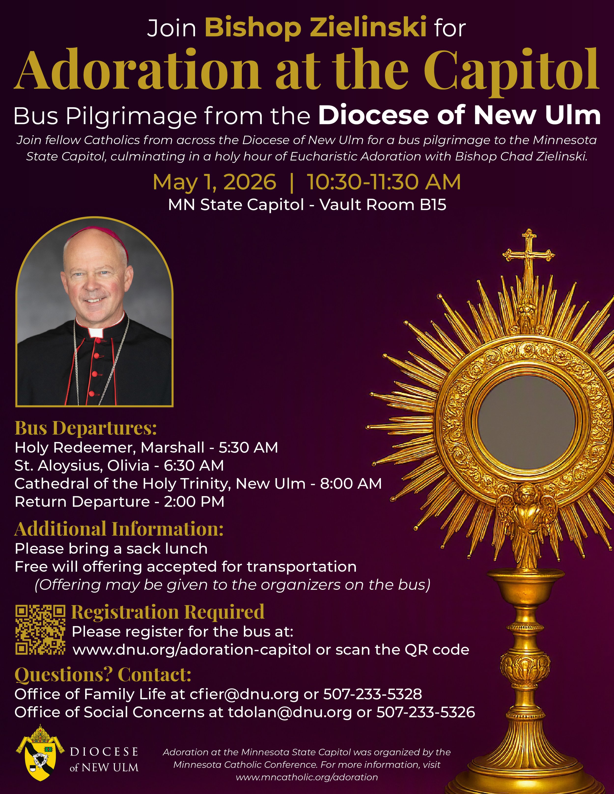 Join fellow Catholics from across the Diocese of New Ulm for a bus pilgrimage to the Minnesota State Capitol, culminating in a holy hour of Eucharistic Adoration with Bishop Chad Zielinski.