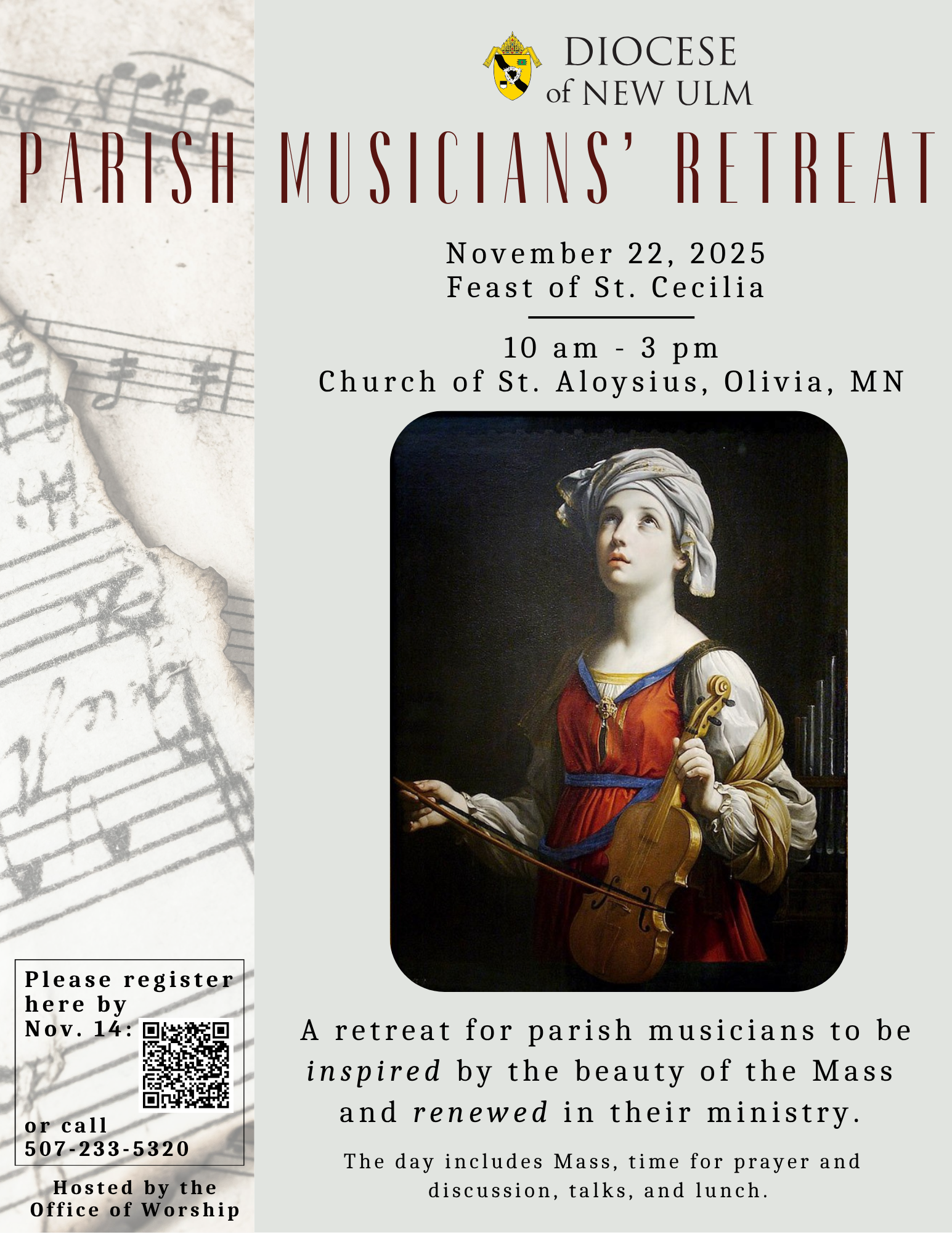 All parish musicians, including music directors, accompanists, cantors, instrumentalists, and choir members, are welcome to attend the Parish Musicians’ Retreat hosted by the Diocese of New Ulm Office of Worship. This is an opportunity for parish musicians to be inspired by the beauty of the Mass and renewed in their ministry. The day includes Mass, time for prayer and discussion, talks, and lunch.