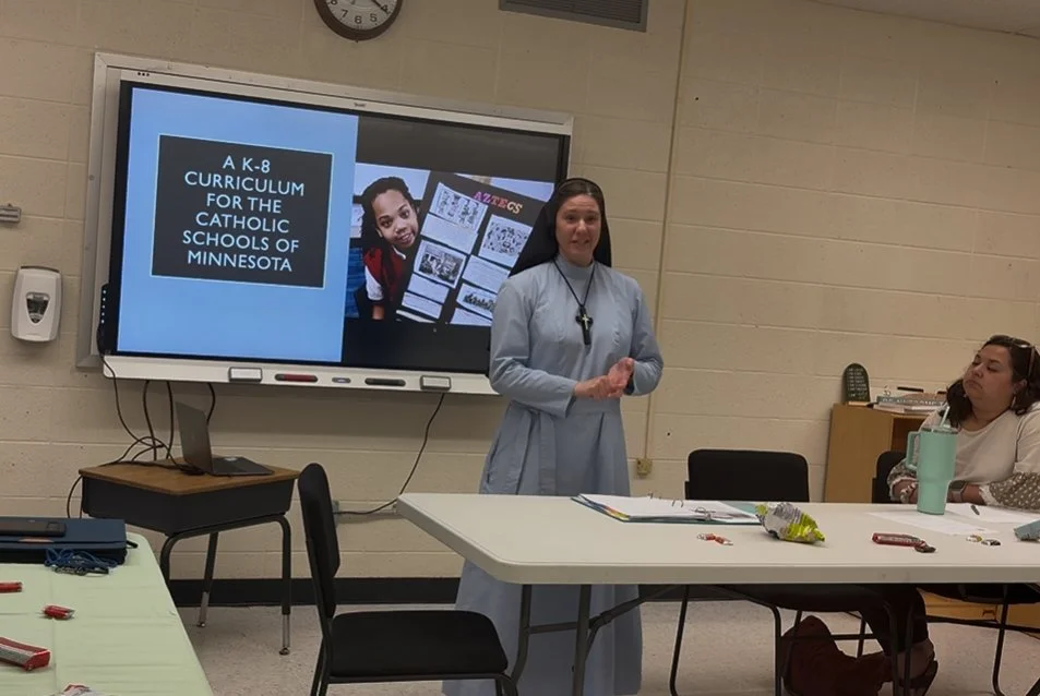 June 10, 2025, Sr. Mary Andrea Lesko, RSM of the Diocese of Winona-Rochester led a training for school leaders regarding the new Social Studies Curriculum Standards. Sr. Mary Andrea served as the chairperson for a team of leaders representing the dioceses of Minnesota that developed the standards. These standards focus on a chronological study of history and will be piloted during the 2025-26 academic year.