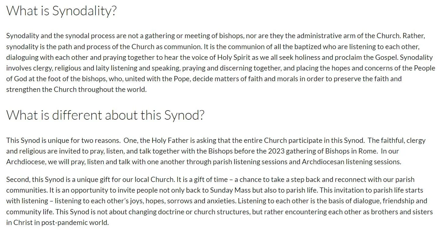 Pope Francis is asking each local diocese to gather – clergy, religious and laity together- to listen to each other. The “goal” of this journeying together is not to create a new vision or pastoral plan with objectives. Rather, the goal of our journeying together is to be present with one another, to listen and learn with each other, and to grow closer to the Lord and His Church.